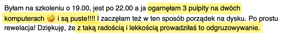 Zakończysz spotkanie z uporządkowanym pulpitem i gotowym systemem ogarniania plików w Twojej firmie. Jeśli nie dasz rady zajrzeć na żywo, otrzmasz także nagranie warsztatu.